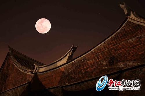 前天晚上,由于天气原因,晋江市民实际看到红月亮的时间打了折扣,不少人感到很遗憾。但在昨晚,晋江宁静的夜空上一轮大大的圆月也特别美,7时30分许,记者在晋江五店市传统街区就着闽南特色的古民居建筑,运用相机的多次曝光功能,将这轮美月定格下来。(记者 董严军 摄)
